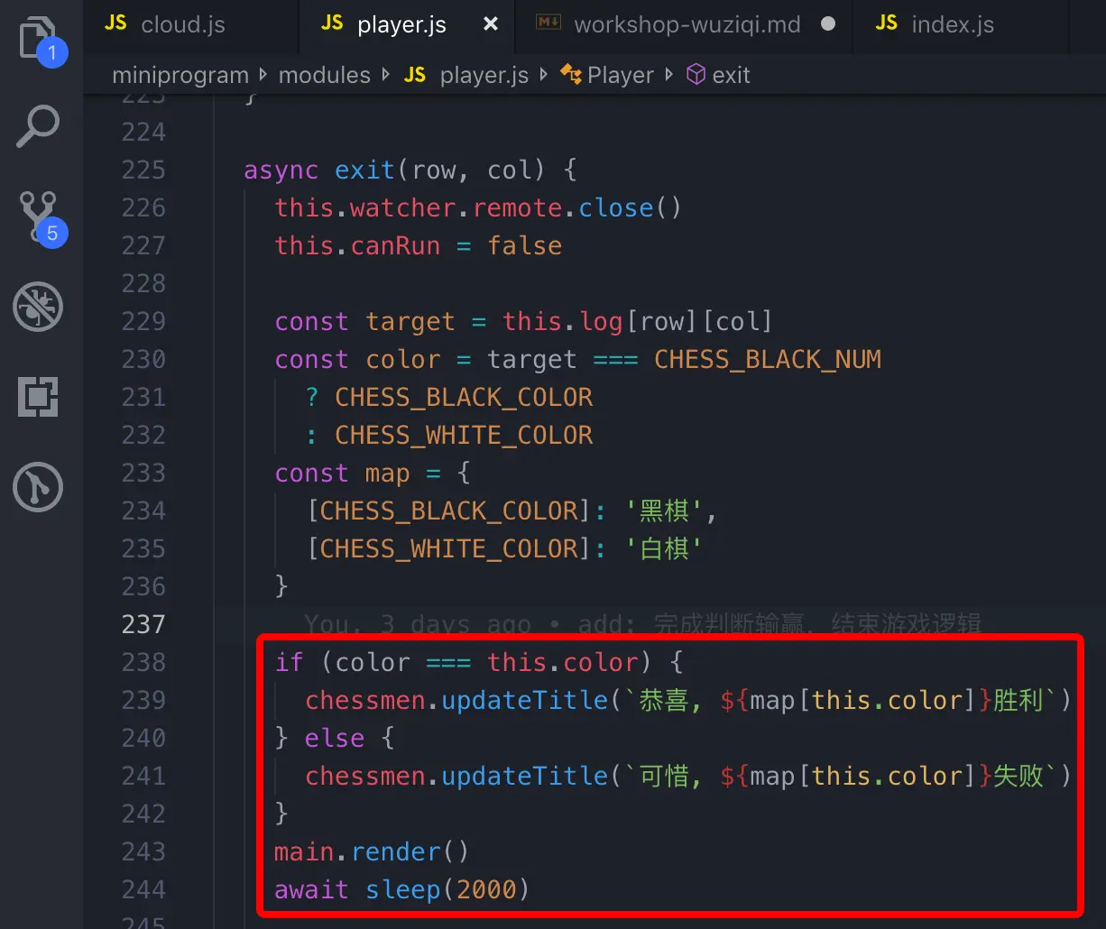 每次需要判定输赢的地方,如果可以判定输赢,那么都会走到游戏退出逻辑。退出的逻辑分为 2 个部分,第 1 个是给用户提示,第 2 个是调用云函数清空记录。
