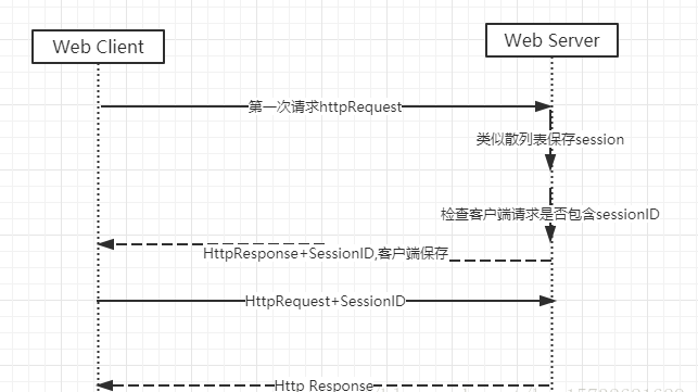 第一次创建session时,服务端会在http协议告诉客户端,需要在cookie类里记录一个session id,以后每次请求会发送这个id到数据库,我就知道你是谁了