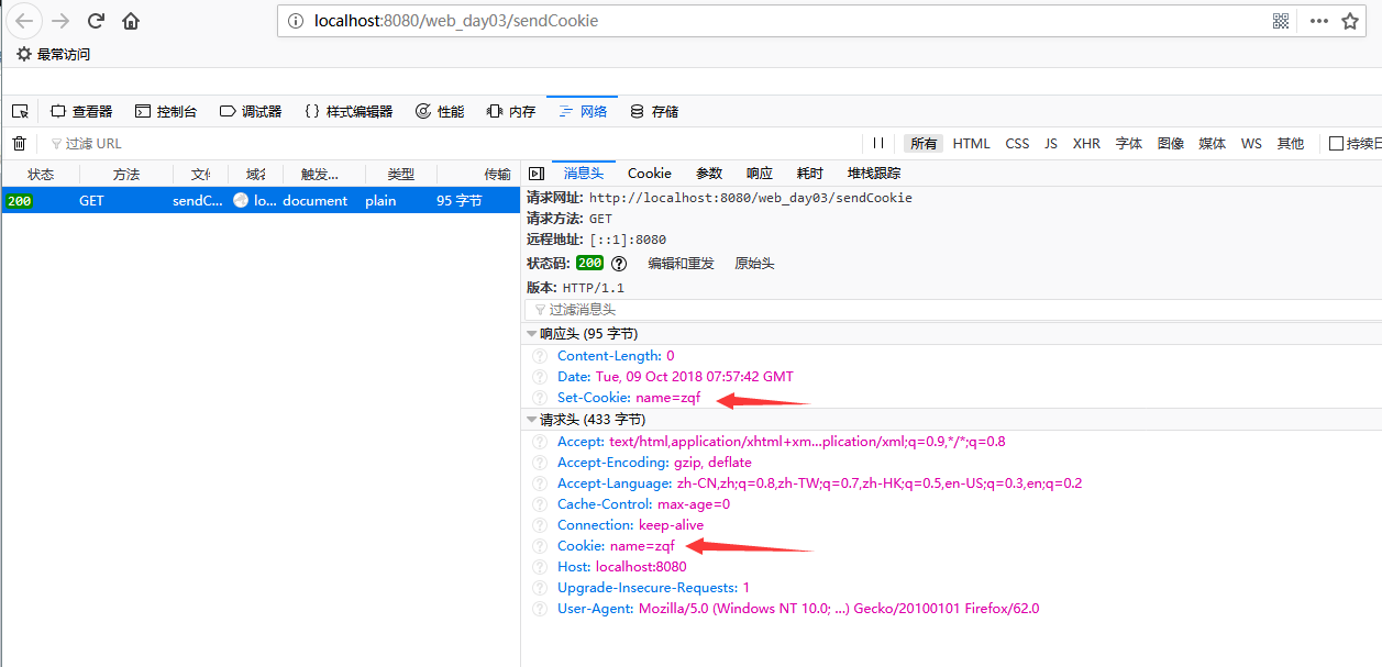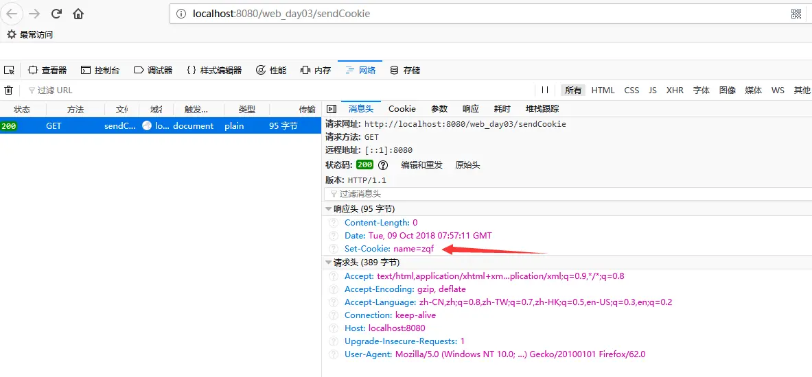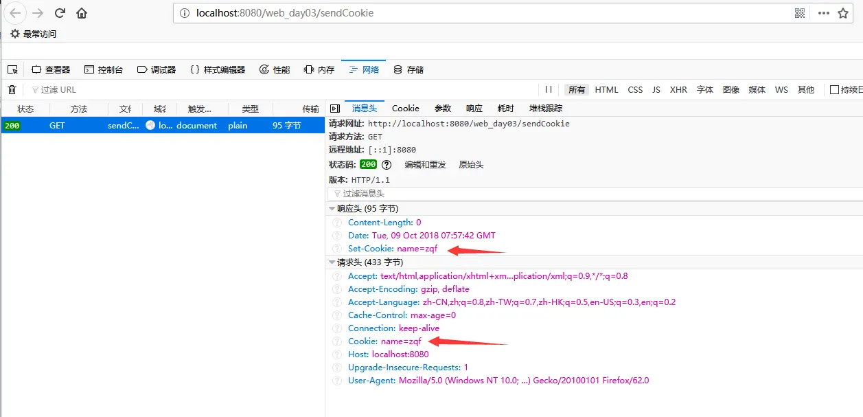 第二次访问可以看到请求头也包含了cookie,是服务器端发送到客户端保存的