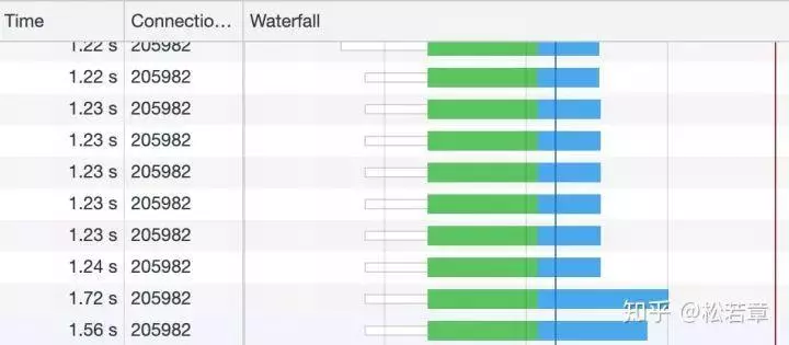 绿色是发起请求到请求返回的等待时间,蓝色是响应的下载时间,可以看到都是在同一个 Connection,并行完成的
