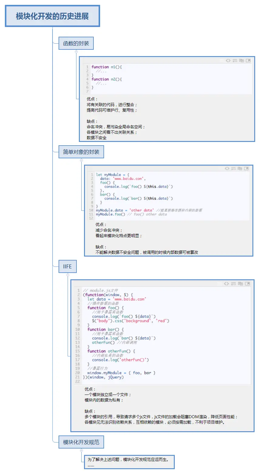 后来IIFE解决了这个问题,我们可以把拆出来的功能模块,单独写在一个js文件中,这样修改起来就方便多了,再也不用在大篇幅不相干的代码中去寻觅我需要的那部分了。