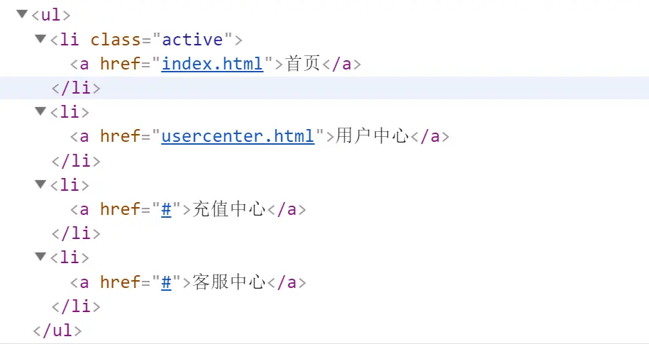 先看左边的导航,在ul中放的是列表项标签li,整个左边导航有4个列表项,所以在ul中放4个li标签,导航是可以点击跳转,所以使用超链接a标签包裹文本,所以结构如下: