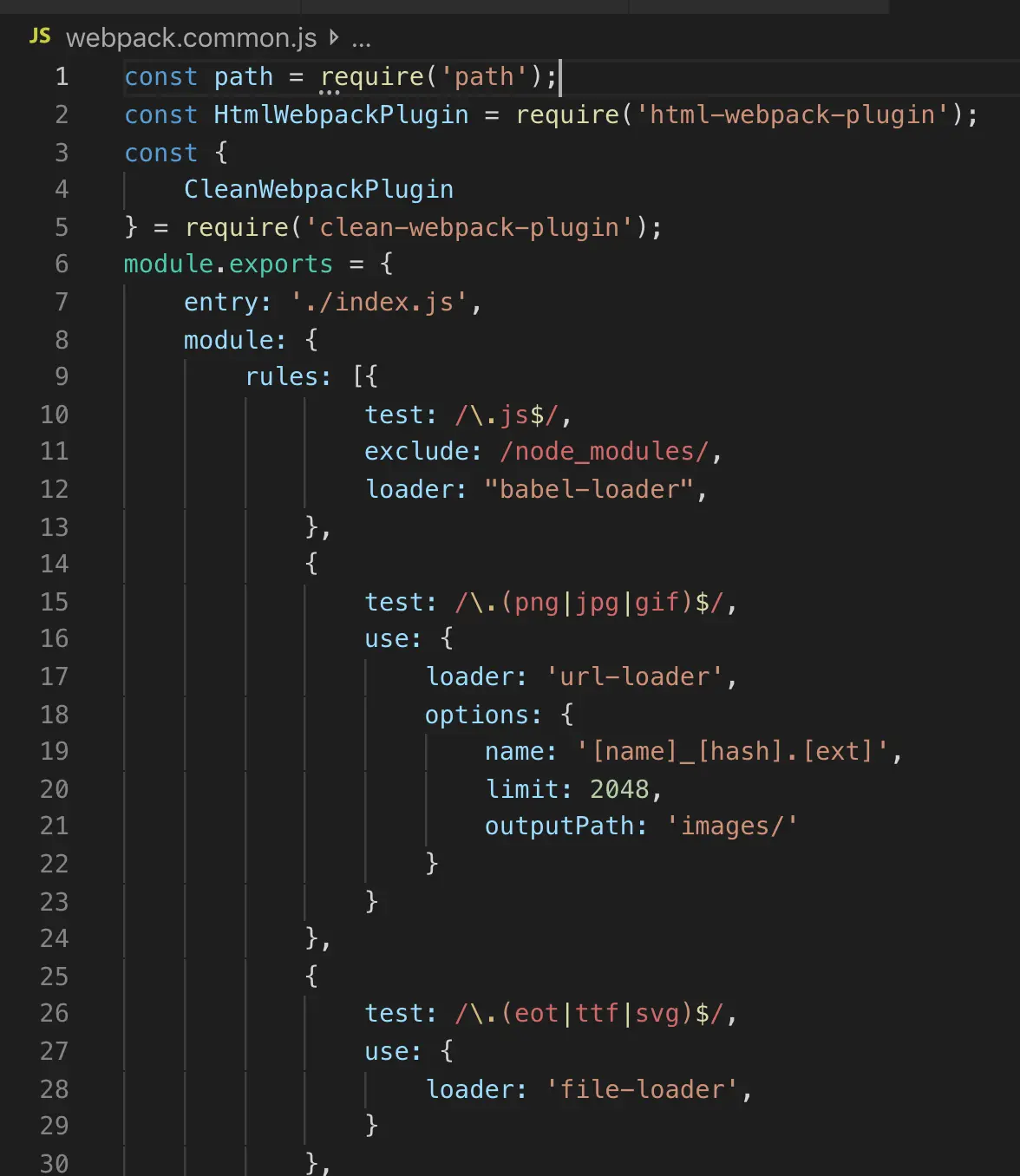 新建 webpack.common.js 文件。把重复的代码放入 webpack.common.js 文件中。