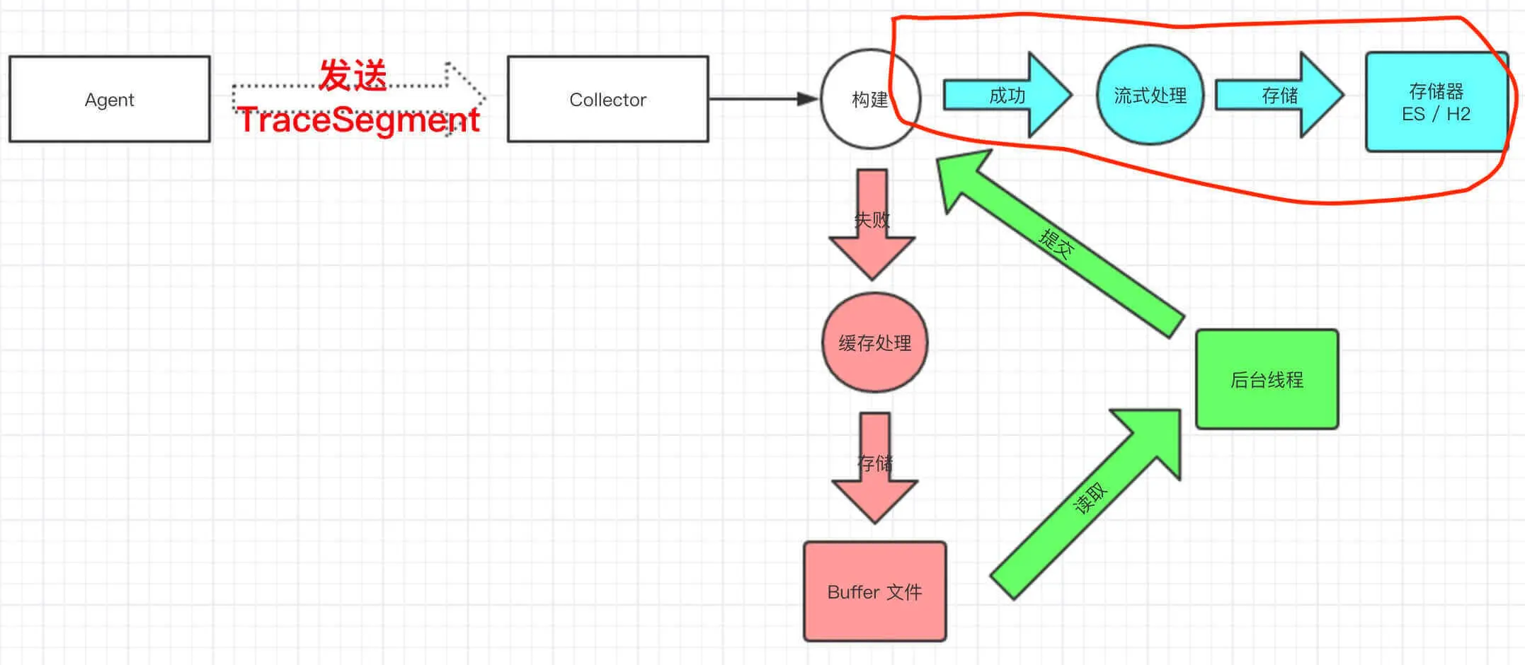 Collector 在接收到 Trace 数据后,经过流式处理,最终存储到存储器。如下图,红圈部分,为本文分享的内容: