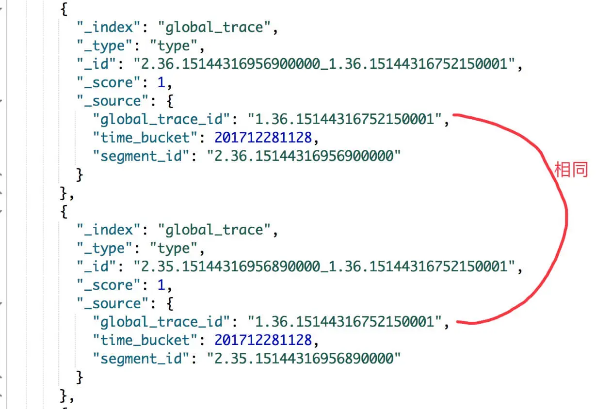 org.skywalking.apm.collector.storage.es.dao.SegmentEsPersistenceDAO,GlobalTrace 的 EsDAO 。- 在 ES 存储例子如下图: