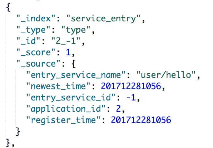 org.skywalking.apm.collector.storage.es.dao.ServiceEntryEsPersistenceDAO,ServiceEntry 的 EsDAO 。- 在 ES 存储例子如下图: