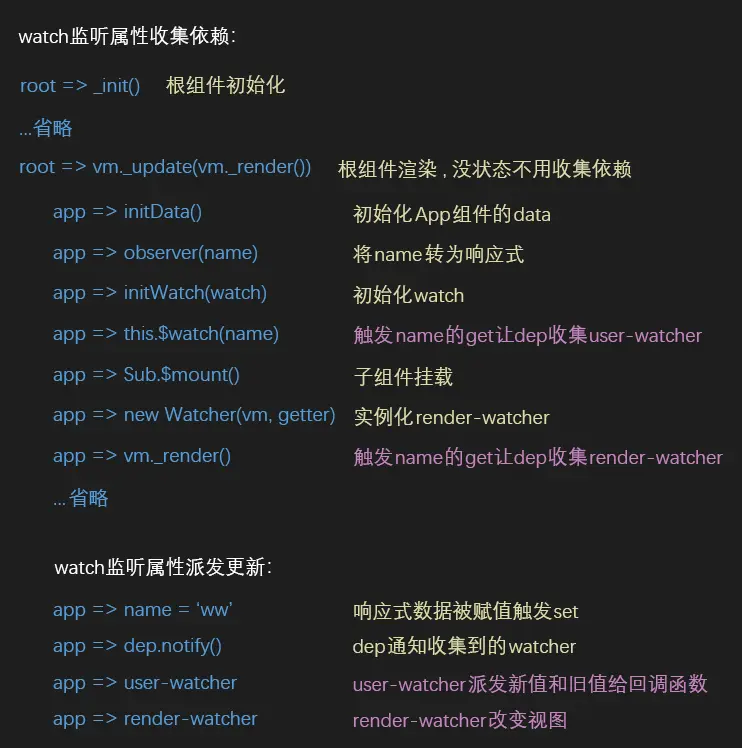 watch总结:为什么计算属性有缓存功能?因为当计算属性经过计算后,内部的标志位会表明已经计算过了,再次访问时会直接读取计算后的值;为什么计算属性内的响应式数据发生变更后,计算属性会重新计算?因为内部的响应式数据会收集computed-watcher,变更后通知计算属性要进行计算,也会通知页面重新渲染,渲染时会读取到重新计算后的值。