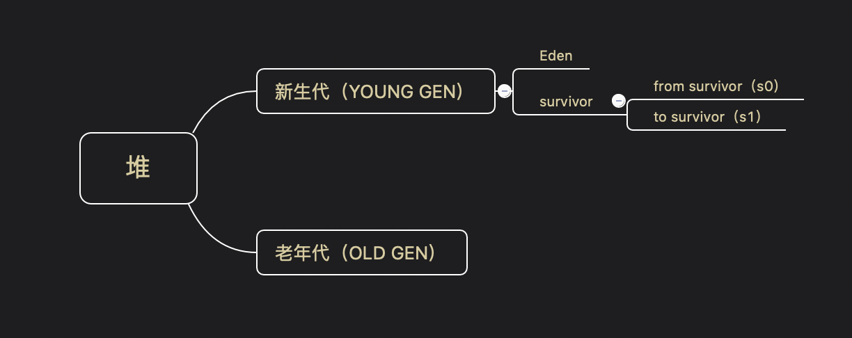 从内存分配的角度上来说,堆内存中包含了新生代内存和老年代内存,而年轻代又分为Eden和Survivor区。Survivor区由From Survivor和To Survivor组成。Eden区占大容量,Survivor两个区占小容量,默认比例是8:1:1,而且JVM 每次只会使用 Eden 和其中的一块 Survivor 区域来为对象服务,所以无论什么时候,总是有一块 Survivor 区域是空闲着的。