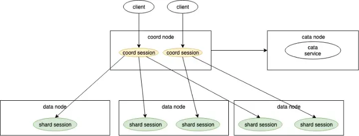 协调节点监听客户端发起的连接请求,连接建立后创建一个 coord session,即协调节点会话,之后便由这个会话处理对应的客户端发起的所有请求。coord session 在接收到客户端发来的处理请求后,会结合编目信息进行分析,确认需要下发到哪些节点去执行,可能会发送给编目节点、一个或多个数据节点。数据节点在接收到协调节点发来的消息时,会创建一个 shard session 来处理请求,执行指定的操作,并返回数据。