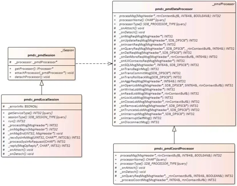 本地会话能绑定不同的 processor 以执行不同的处理流程。对于协调节点,绑定的是 _pmdCoordProcessor。对于编目节点和数据节点,绑定的是 _pmdDataProcessor。对于协调节点,会先调用 _pmdCoordProcessor 的接口进行消息处理,在无法识别请求类型时,则会再次调用 _pmdDataProcessor 的接口进行处理。