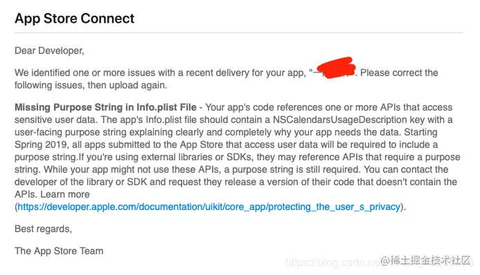 通常这种问题是项目里的info.plist里的隐私权限说明没有添加,这个时候你的苹果账号的邮箱会收到一封苹果发过来的邮件,里面有详细说明