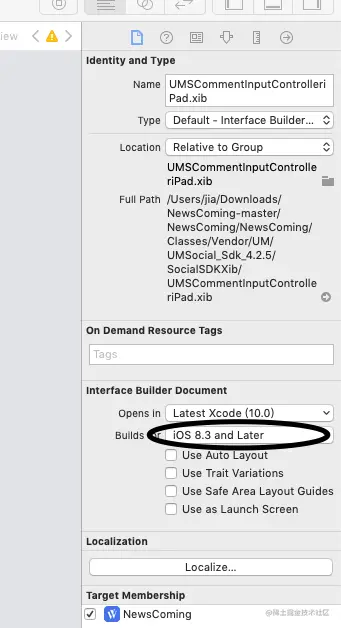 意思是你编译IB的文档不受支持了,也就是说你的xib编译的版本太低了,修改图中标记的版本号即可: