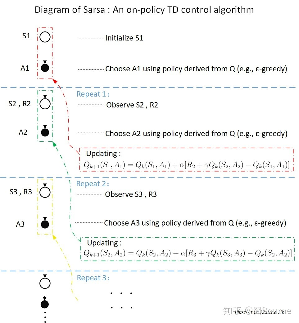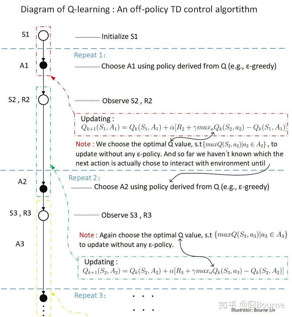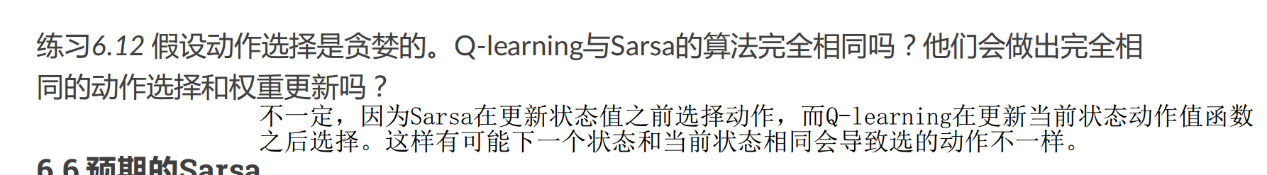 Sarsa和Q-learning的区别:QL(和expected Sarsa)更新Q值没有用到behavior policy产生的下一个动作。Sarsa用policy产生的下一个动作的值来更新Q值。