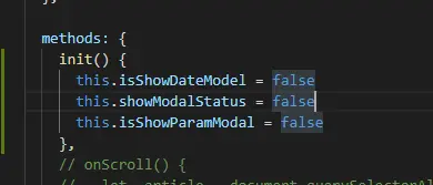 2、列表页进入到详情页,经过操作有弹出层,如果此时点击左上角的返回按钮,再次进入到详情页,弹出层会继续存在,但这不是我们想要的结果,我们想要的结果是和第一次进入页面一样,经过一些操作之后才会有弹出层,这时我们在生命周期beforeMount()中init数据,如下图,这样进入页面后就不会直接显示弹窗