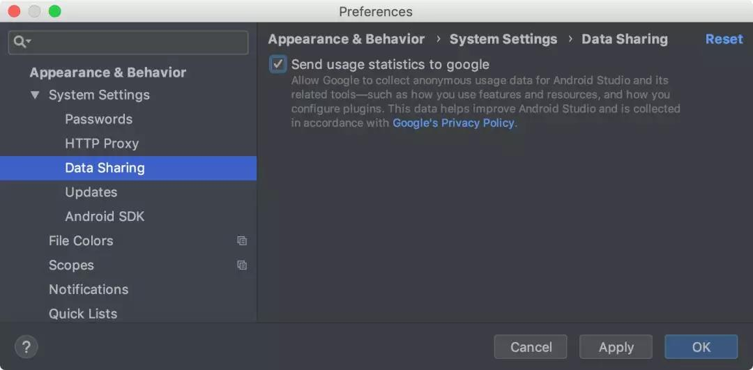 我们基于开发者提交的反馈与指标数据,判断 Android Studio 中有哪些内容适用于 Project Marble 计划,并决定具体的优化项目和实现手段。开发者可自愿在 Android Studio 内勾选数据分享,收集上来的数据将帮助团队判定产品是否含有波及全体用户的问题,接着在此基础上,调整功能开发工作的顺序,优先解决最令用户头疼的问题。为了获取最优洞见,我们在产品整合了多种不同的反馈渠道,指标数据分享是其中最基本的一款反馈工具,您可通过以下路径在 Android Studio 中启用该功能 Preferences /Settings → Appearance & Behavior → Data Sharing。