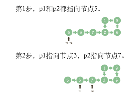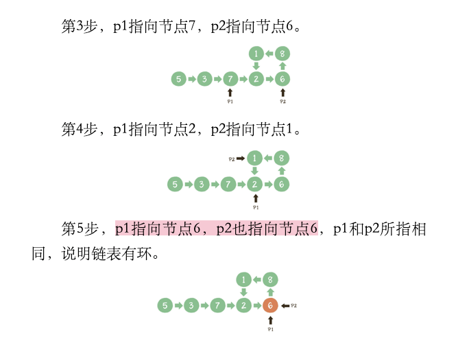 方法: 首先创建两个指针 p1 和 p2,让他们同时指向这个链表的头节点。然后开始一个大循环,让 p1 每次向后移动 1 个节点,p2 每次向后移动 2 个节点,然后比较两个指针指向的节点是否相同。如果相同,则可以判断出链表有环,如果不同,则继续下一次循环。