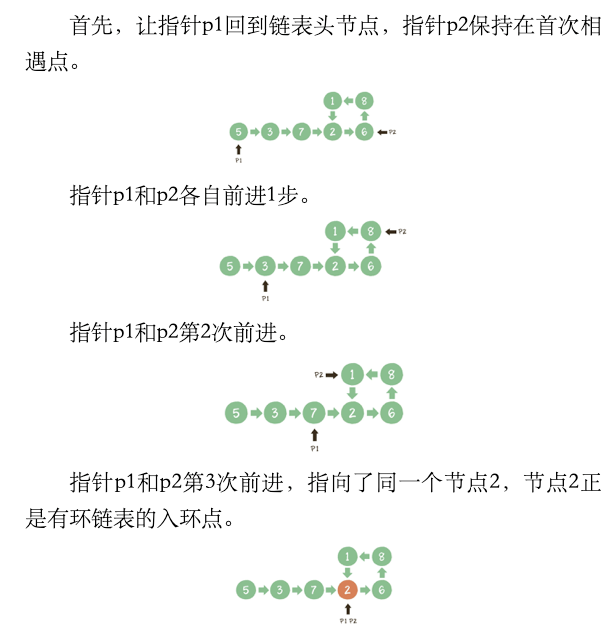 等式经过整理得出:D=(n1)(S1+S2)+S2也就是说,从链表头结点到入环点的距离,等于从首次相遇点绕环n1圈再回到入环点的距离。这样一来,只要把其中一个指针放回到头节点位置,另一个指针保持在首次相遇点,两个指针都是每次向前走1步。那么,它们最终相遇的节点,就是入环节点。