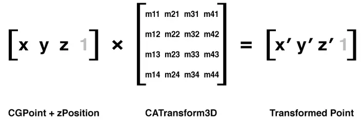 和CGAffineTransform类似,CATransform3D也是一个矩阵,但是和2x3的矩阵不同,CATransform3D是一个可以在3维空间内做变换的4x4的矩阵。