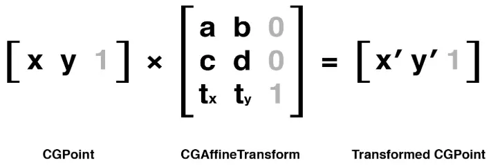用CGPoint的每一列和CGAffineTransform矩阵的每一行对应元素相乘再求和,就形成了一个新的CGPoint类型的结果。要解释一下图中显示的灰色元素,为了能让矩阵做乘法,左边矩阵的列数一定要和右边矩阵的行数个数相同,所以要给矩阵填充一些标志值,使得既可以让矩阵做乘法,又不改变运算结果,并且没必要存储这些添加的值,因为它们的值不会发生变化,但是要用来做运算。