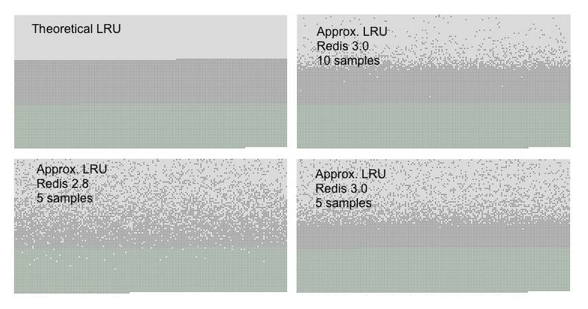 我们可以通过一个实验对比各LRU算法的准确率,先往Redis里面添加一定数量的数据n,使Redis可用内存用完,再往Redis里面添加n/2的新数据,这个时候就需要淘汰掉一部分的数据,如果按照严格的LRU算法,应该淘汰掉的是最先加入的n/2的数据。 生成如下各LRU算法的对比图(图片来源):