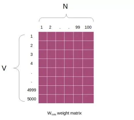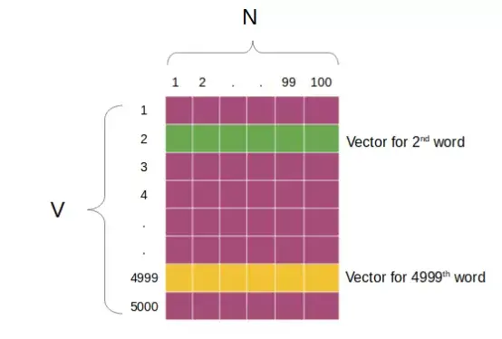 如上所示,权重矩阵的规格为5000x100。第一行对应词汇表中的第一个单词,第二行对应第二个,以此类推。