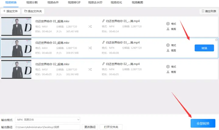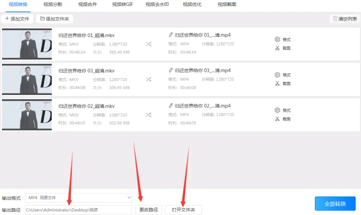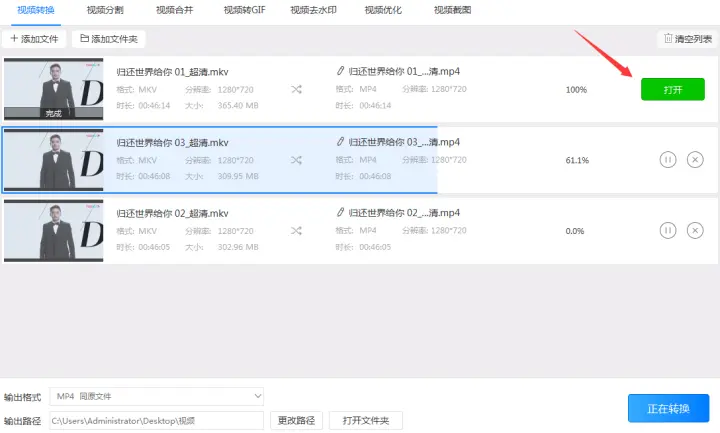 5、转换完成后找到在第三步预设好的输出路径或者点击覆盖在转换按钮上的打开按钮就可以到达视频输出的路径找到转换后的mp4格式了。