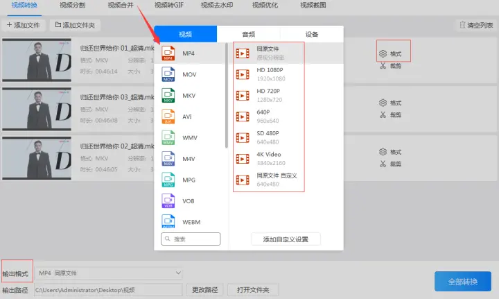 2、随后点击格式按钮调整格式转换后输出的视频格式,由于我们要把爱奇艺的qsv格式转换成mp4格式所以要把输出的视频格式调整为mp4格式。
