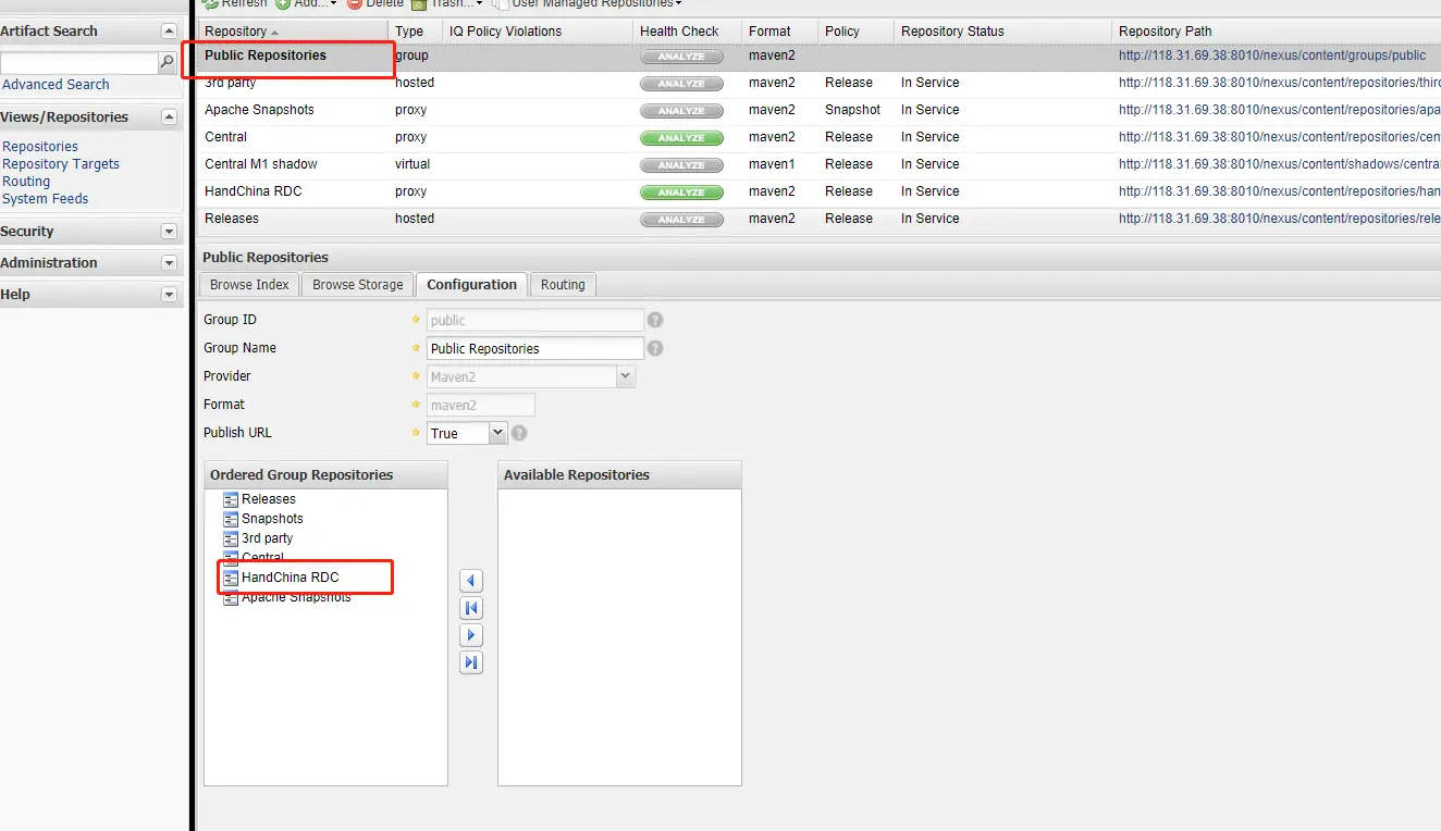 记一次nexus私服实践 caeserchen 2019-08-29 586 阅读1分钟 在项目实践中,需要搭建自己的私服,实际过程中遇到一个问题,我们项目对dubbo的依赖版本是2.8.4,而远程的中央仓库中,Central库里面是没有这个版本的,如下: 而在HandChina RDC库中发现了这个版本,如下: 我们的私服在初始化搭建后,会默认引用Central为代理库,所以在通过私服拉取依赖时,是拉不下来2.8.4版本的包的,这就需要添加代理仓库HandChina RDC 添加完成后,发现还是拉取不下来 仔细看settings.xml文件 发现设置了镜像是从public这个组中拉取,故而需要将上述刚添加的代理库加入到这个group中来 添加完成后,拉取成功