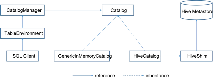 目前 Catalog 有两个实现,GenericInMemoryCatalog 和 HiveCatalog。其中 GenericInMemoryCatalog 保持了原有的 Flink 元数据管理机制,将所有元数据保存在内存中。而 HiveCatalog 会与一个 Hive Metastore 的实例连接,提供元数据持久化的能力。要使用 Flink 与 Hive 进行交互,用户需要配置一个 HiveCatalog,并通过 HiveCatalog 访问 Hive 中的元数据。另一方面,HiveCatalog 也可以用来处理 Flink 自身的元数据,在这种场景下,HiveCatalog 仅将 Hive Metastore 作为持久化存储使用,写入 Hive Metastore 中的元数据并不一定是 Hive 所支持的格式。一个 HiveCatalog 实例可以同时支持这两种模式,用户无需为管理 Hive 和 Flink 的元数据创建不同的实例。