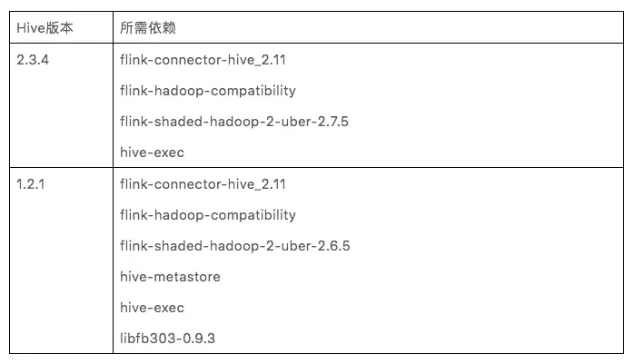 其中 flink-shaded-hadoop-2-uber 包含了 Hive 对于 Hadoop 的依赖。如果不用 Flink 提供的包,用户也可以将集群中使用的 Hadoop 包添加进来,不过需要保证添加的 Hadoop 版本与 Hive 所依赖的版本是兼容的(Hive 2.3.4 依赖的 Hadoop 版本是 2.7.2;Hive 1.2.1 依赖的 Hadoop 版本是 2.6.0)。