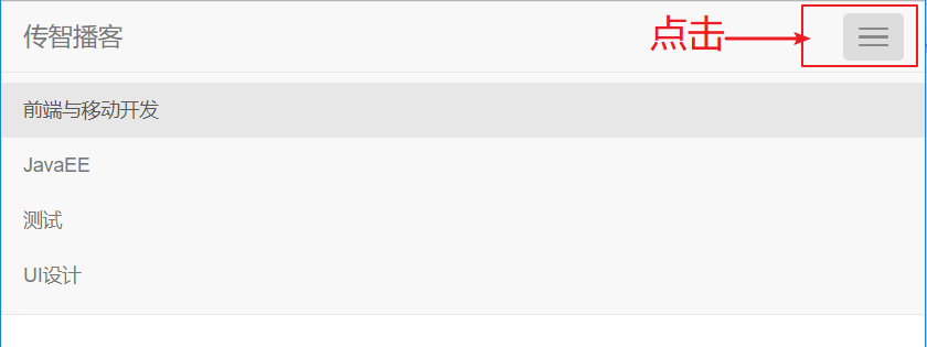01 02 03 04 05 06 07 08 09 10 11 12 13 14 15 16 17 18 19 20 21 22 23 24 25 26 27 28 29 30 31 32 33 34 35 36 37 38 39 40 41 42 43 | <nav class="navbar navbar-default" role="navigation"> <div class="container-fluid"> <div class="navbar-header"> <button type="button" class="navbar-toggle" data-toggle="collapse" data-target="#example-navbar-collapse"> <span class="sr-only">切换导航</span> <span class="icon-bar"></span> <span class="icon-bar"></span> <span class="icon-bar"></span> </button> <a class="navbar-brand" href="#">传智播客</a> </div> <div class="collapse navbar-collapse" id="example-navbar-collapse"> <ul class="nav navbar-nav"> <li class="active"><a href="#">前端与移动开发</a></li> <li><a href="#">JavaEE</a></li> <li><a href="#">测试</a></li> <li><a href="#">UI设计</a></li> </ul> </div> </div></nav> |