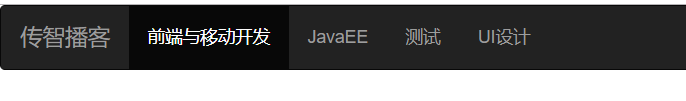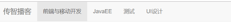 01 02 03 04 05 06 07 08 09 10 11 12 13 14 15 16 17 18 19 20 21 22 23 24 25 26 27 28 29 | <nav class="navbar navbar-default" role="navigation"> <div class="container-fluid"> <div class="navbar-header"> <a class="navbar-brand" href="#">传智播客</a> </div> <div> <ul class="nav navbar-nav"> <li class="active"><a href="#">前端与移动开发</a></li> <li><a href="#">JavaEE</a></li> <li><a href="#">测试</a></li> <li><a href="#">UI设计</a></li> </ul> </div> </div></nav> |