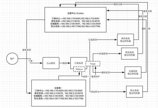 - 在发起调用之前,订单系统还得通过Ribbon 去注册中心去拉取各系统的注册表信息,并且挑一台机器给 Feign 来发起网络调用。