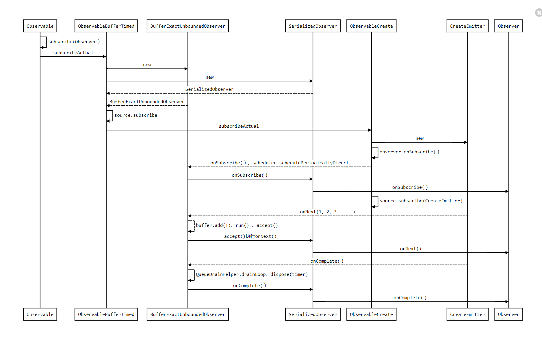 这样buffer(timespan, unit) 的整个流程就分析完了。上面示例分析加了interval 和 take ,所以会有些复杂。 下面看下简单的示例