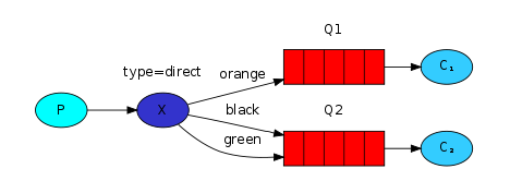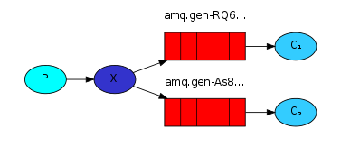 使用交换机时,每个消费者有自己的队列,生产者将消息发送到交换机(X),每个队列都要绑定到交换机。
