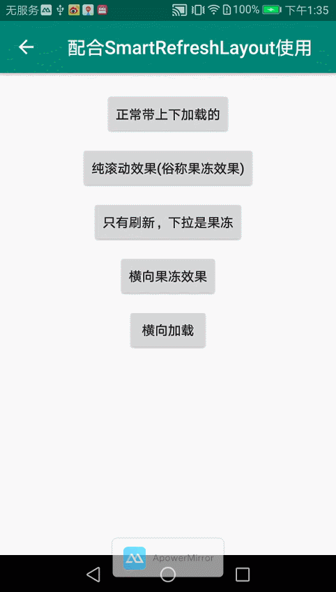 - 配合SmartRefreshLayout使用,各种果冻效果,上拉,下拉。以及横向recyclerView果冻,左滑更多等