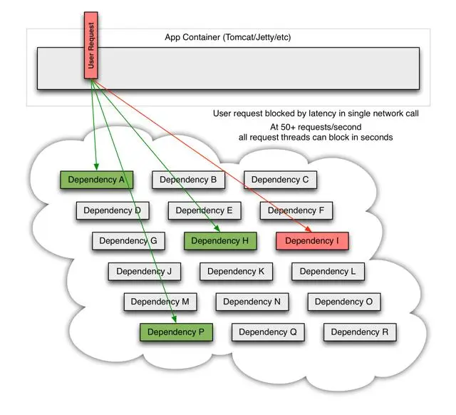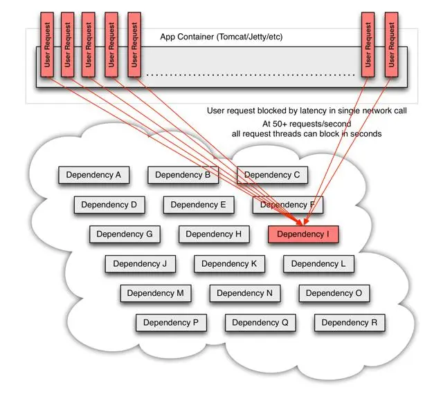 在高并发访问下,这些依赖的稳定性与否对系统的影响非常大,但是依赖有很多不可控问题:如网络连接缓慢,资源繁忙,暂时不可用,服务脱机等,如下图: