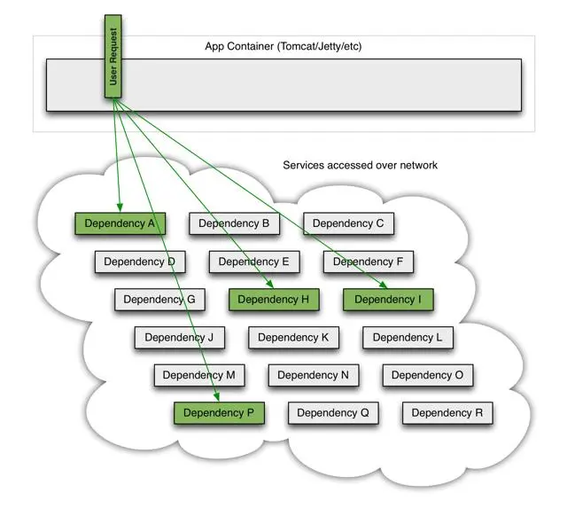 在大中型分布式系统中,通常系统很多依赖,如下图: