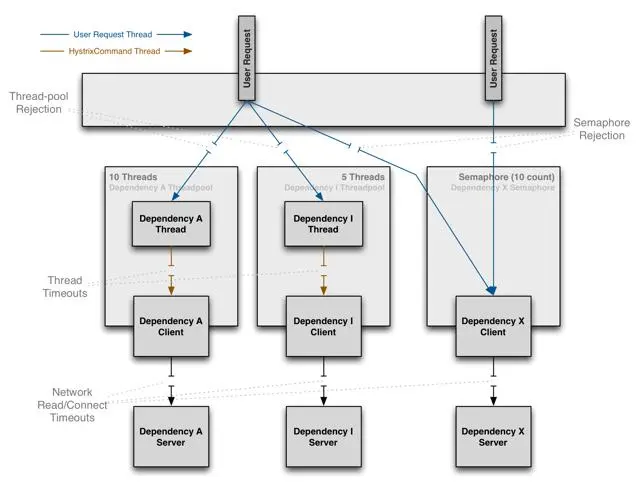 - 为每个依赖提供一个小的线程池或信号,如果线程池已满调用将被立即拒绝,默认不采用排队。加速失败判定时间。