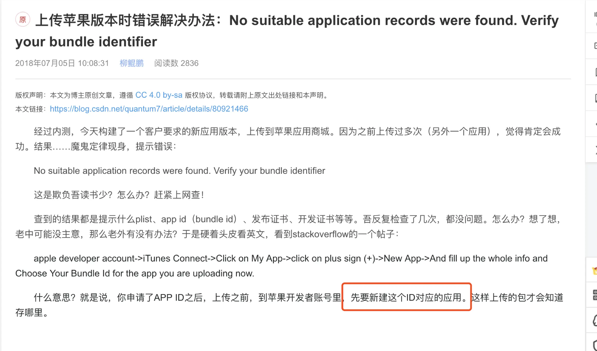 上传苹果版本时错误解决办法:No suitable application records were found. Verify your bundle identifier