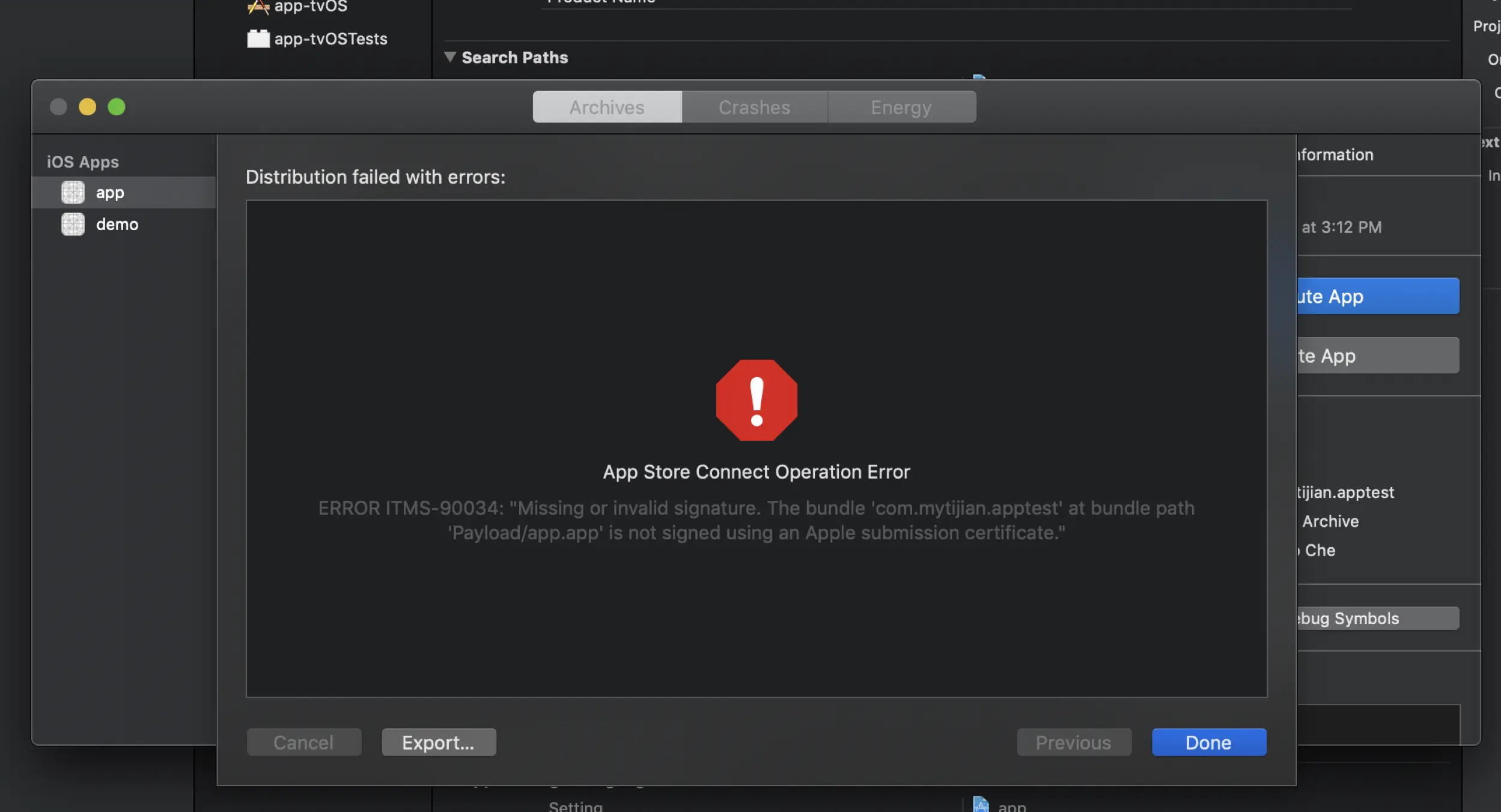 ERROR ITMS-90034: "Missing or invalid signature. The bundle 'com.mytijian.apptest' at bundle path