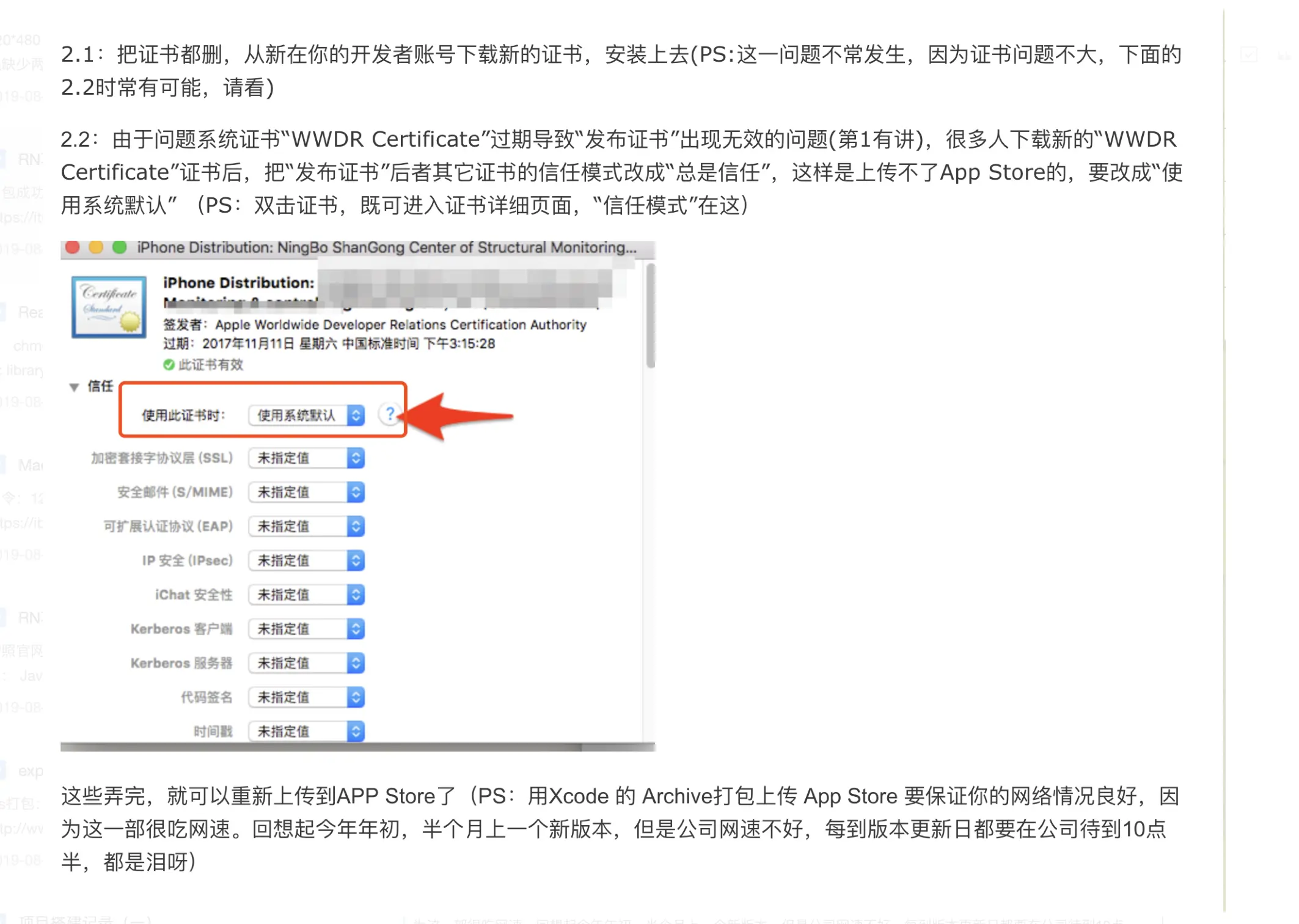 - 检查证书的信任模式,不能是“总是信任”,要改成“使用系统模式”