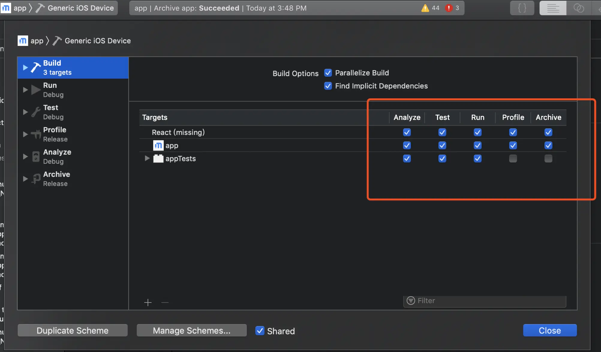 另外注意不要把apptests里面的archive勾选上,不然会打包报错