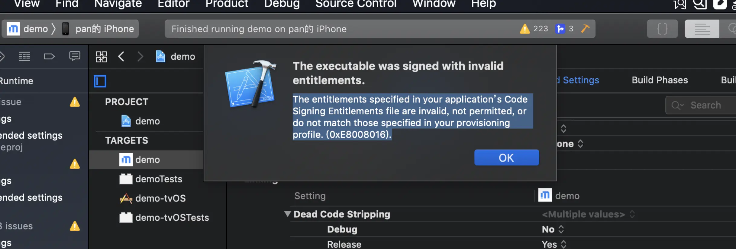 真机调试时报错:The executable was signed with invalid entitlements. The entitlements specified in your application’s Code Signing Entitlements file are invalid, not permitted, or do not match those specified in your provisioning profile. (0xE8008016).