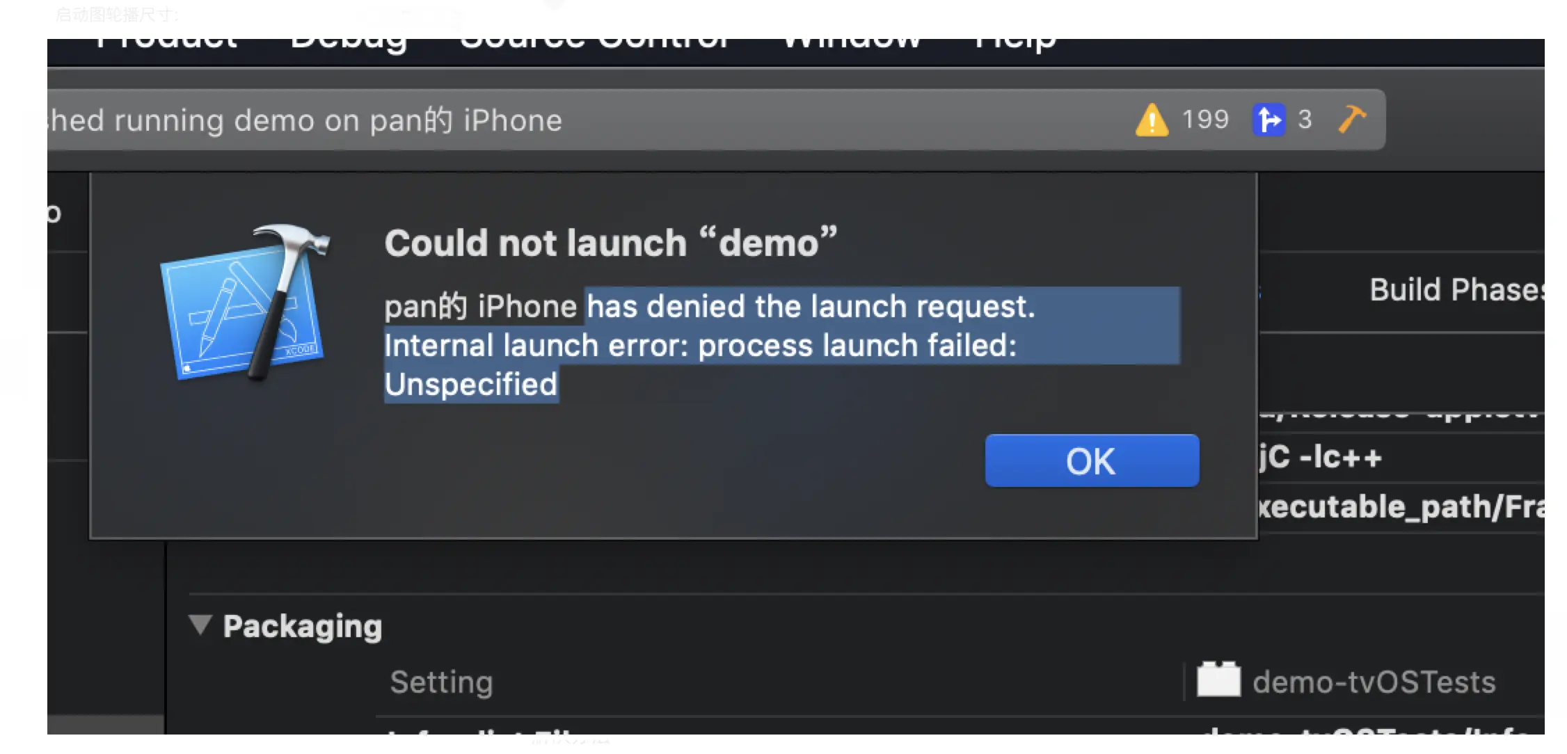 真机调试时报错: Could not launch “demo” pan的 iPhone has denied the launch request. Internal launch error: process launch failed: Unspecified