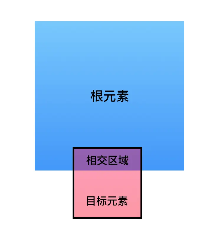 - intersectionRect:目标元素与视口(或根元素)的交叉区域的信息,图中蓝色方块和粉红色方块相交的区域。