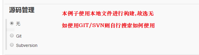 此选项是指,执行构建的代码,从哪里来的,一般正常开发是需要代码版本控制的. 由于此教程宗旨为无版本控制的教程,故选取无