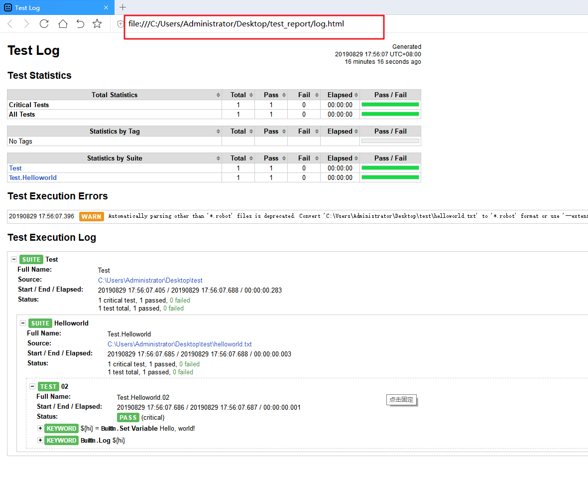 至此,出现helloworld即证明用例已经被RIDE运行,接下来运用robot命令进行测试