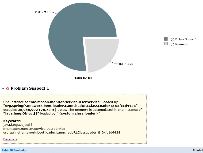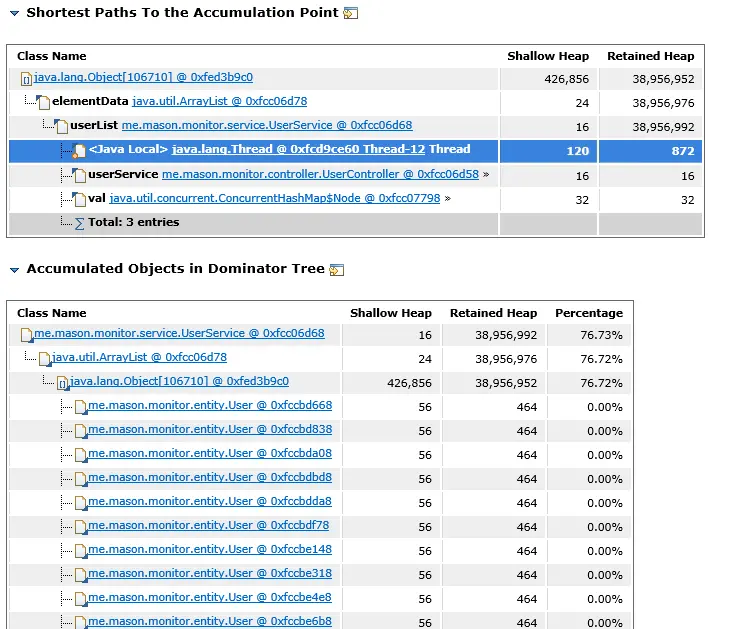 如上图,报告已指出UserService占用了76.73%的内存,而这些内存都在Object[]这个数组中。因此,很大一种可能是这个对象中的数组数量过大。点击Details可以查看更详细的内容: