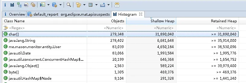 点击Overview页面Actions区域内的“Histogram视图”或点击工具栏的“histogram”按钮,可以显示直方图列表,它以Class类的维度展示每个Class类的实例存在的个数、 占用的Shallow heap 和 Retained内存大小,可以分别排序显示。如下图所示: